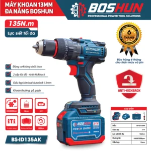 Boshun BS-ID135AK nổi bật nhờ động cơ khỏe, 21V, có khoan búa và chống giật. Đây là mẫu máy phù hợp với người muốn làm nhiều việc hơn mức cơ bản.